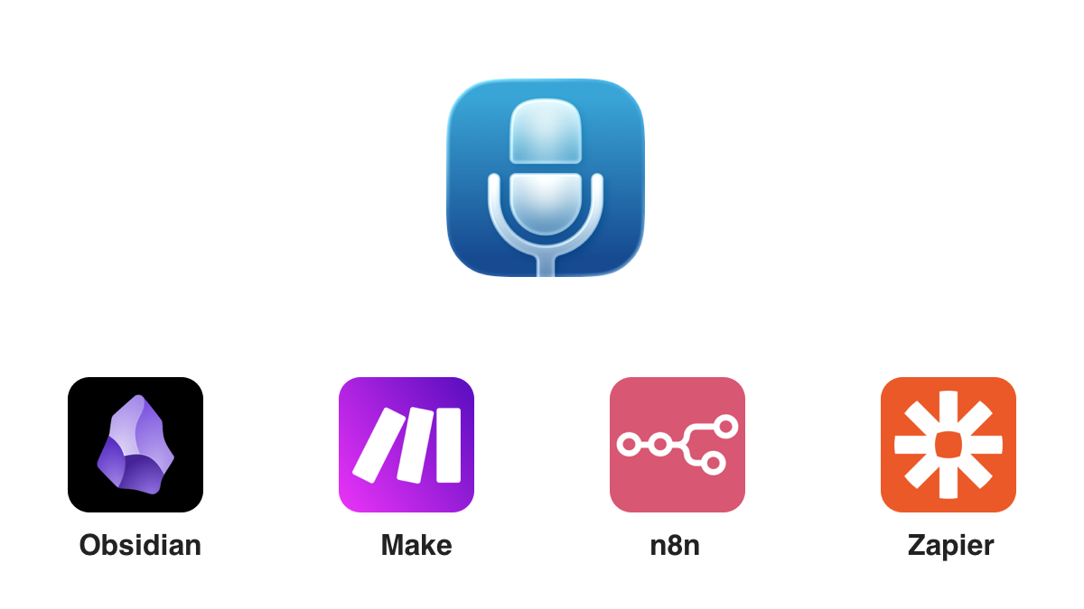 From version 13.6 onwards you can connect MacWhisper to a variety of automation and note-taking services. This lets you automatically forward finished transcripts to tools like Zapier, Make.com, n8n, your own custom webhook, or a local Obsidian vault.